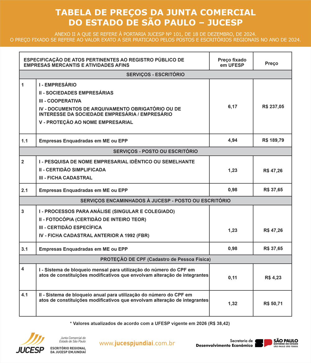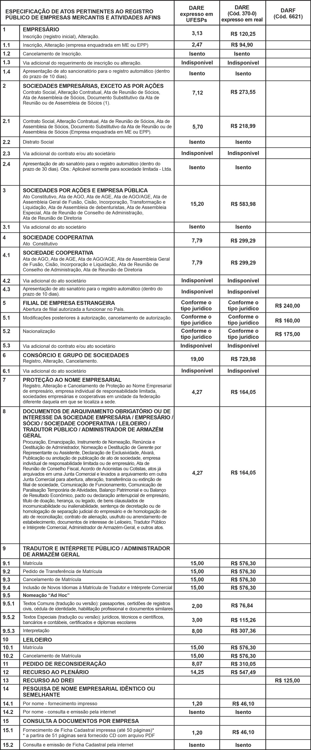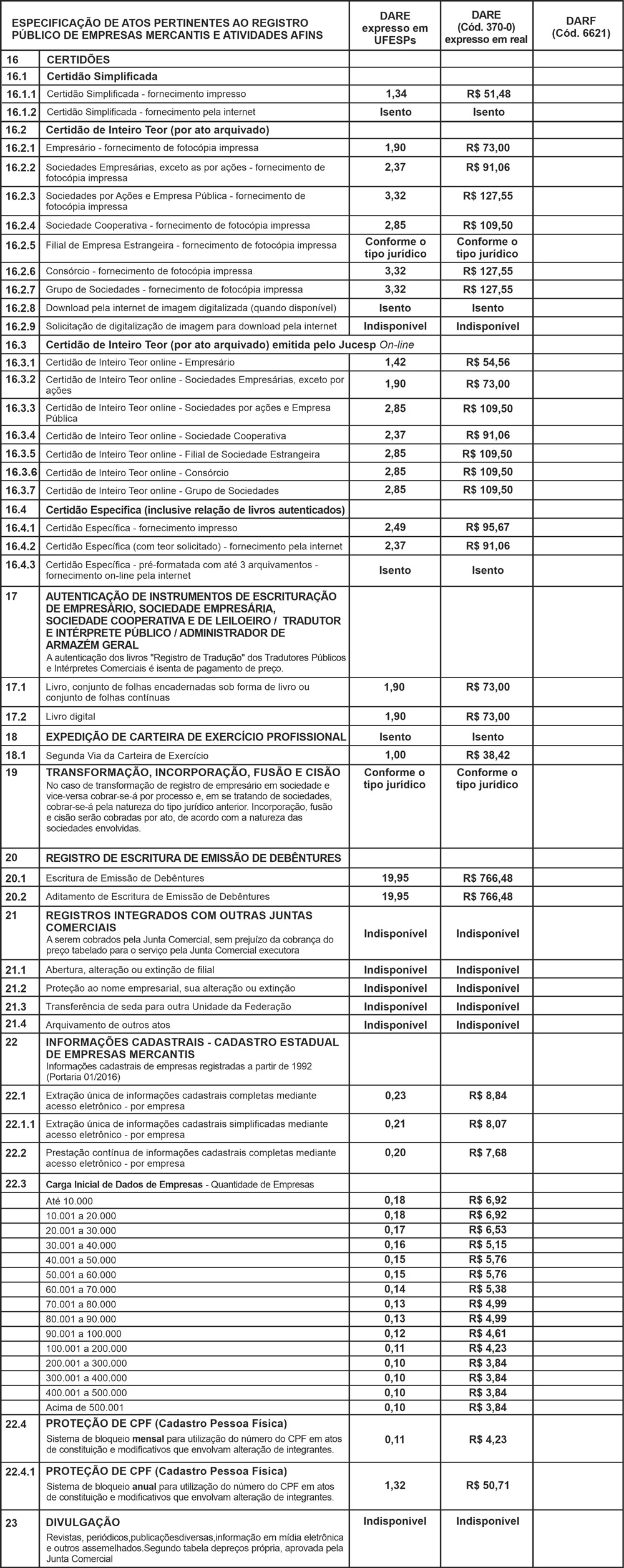 TABELA DE PREÇOS DA JUNTA COMERCIAL DO ESTADO DE SÃO PAULO – JUCESP